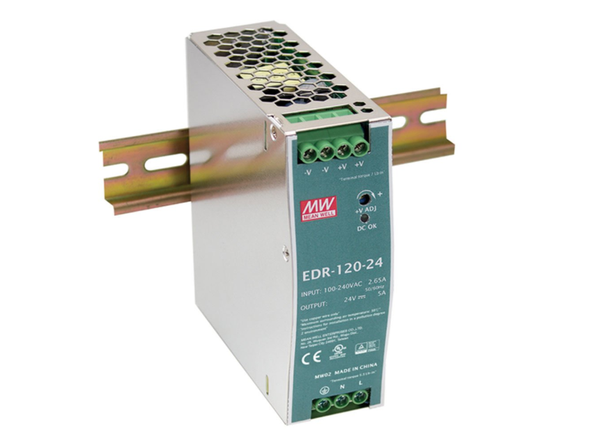 Single output industrial DIN rail power supply 24 Volts 6.5/5.2 Amps 156/125 Watts 24 Volts 6.5/5.2 Amps specifications output power (W): 156/125 ripple & noise (mV p-p): 150 load regulation (): 1 percent line regulation (): 0.5 percent efficiency: 87 percent size (L x W x H) inches: 4.5 x 1.6 x 4.9 universal AC input/full range built-in active PFC function protections: short circuit, over voltage, overload, over temperature cooling by free air convection 100 percent full load burn-in Test 2 year warranty detailed specifications: primary output voltage (VDC): 24 output current (a): 5.2 maximum output power (W): 150 family: edr-150 input voltage (VAC): 90 to 264 input frequency: